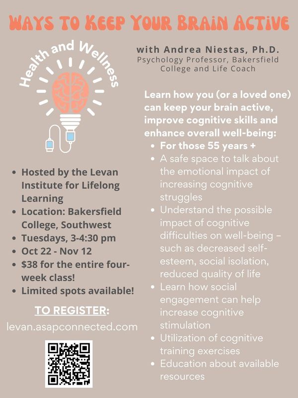 How do you know if your or a loved one’s mental functioning is declining as a normal process or if it is something that must be addressed clinically? Learn about how the brain functions including memory, attention, problem-solving, and decision-making. This class provides an opportunity to talk about the emotional impact of increasing cognitive struggles on yourself or a loved one, how the brain functions and what you can do to keep your brain active. You will leave with an individual plan for improving your cognitive skills and overall well-being.